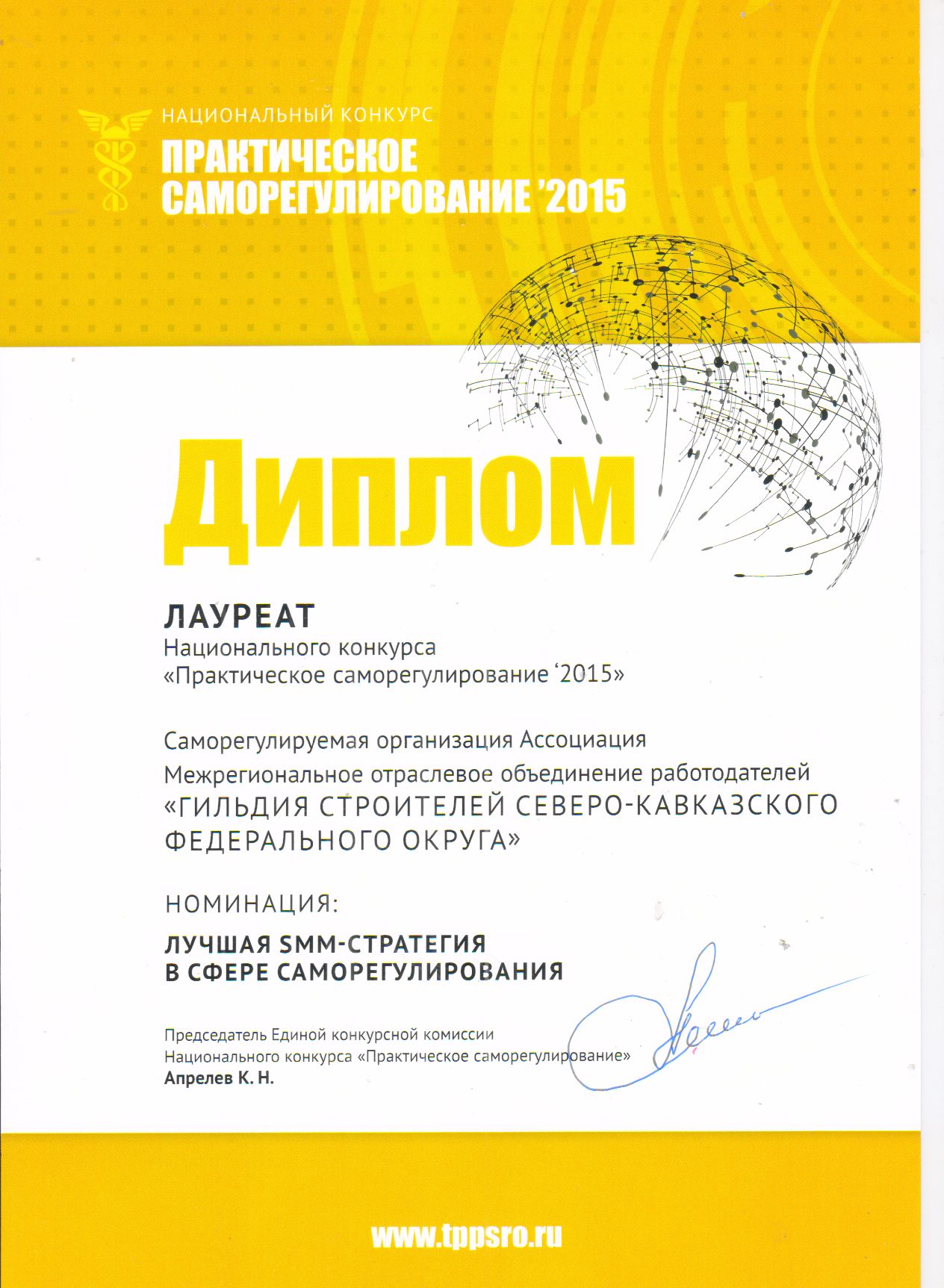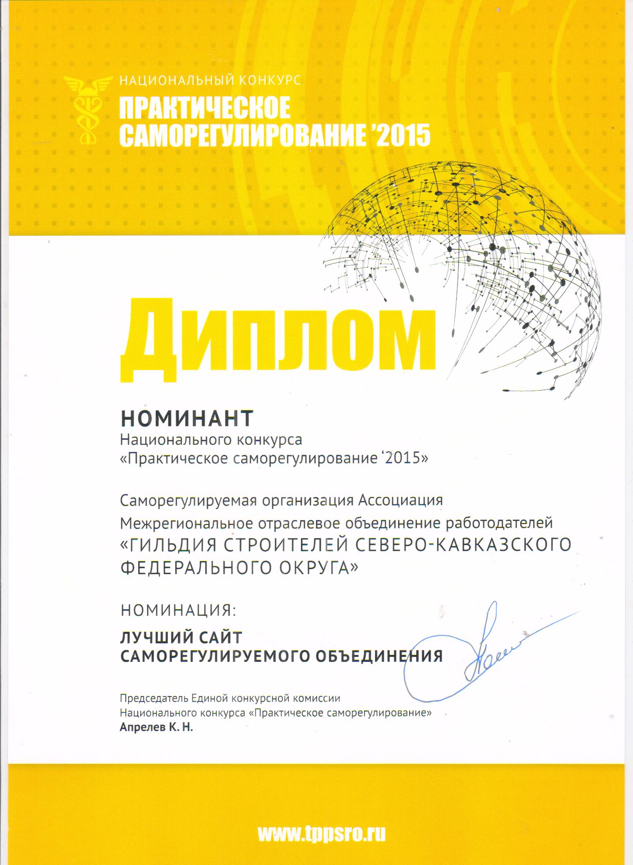Диплом в номинации «Лучший сайт саморегулируемого объединения – 2015» (в тройке лучших).