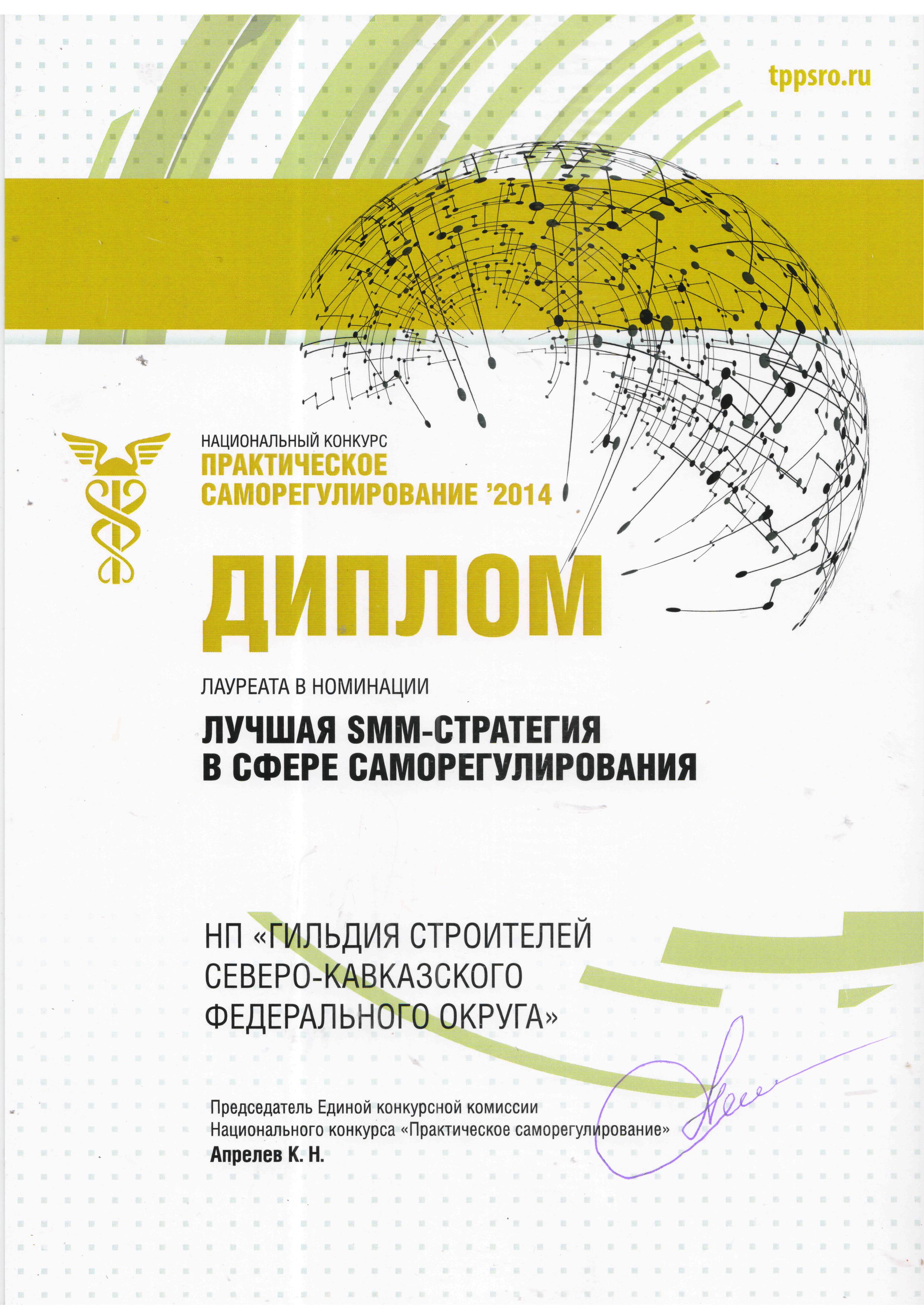 Диплом в номинации «Лучшая SMM - стратегия в сфере саморегулирования -2014»( в тройке победителей).