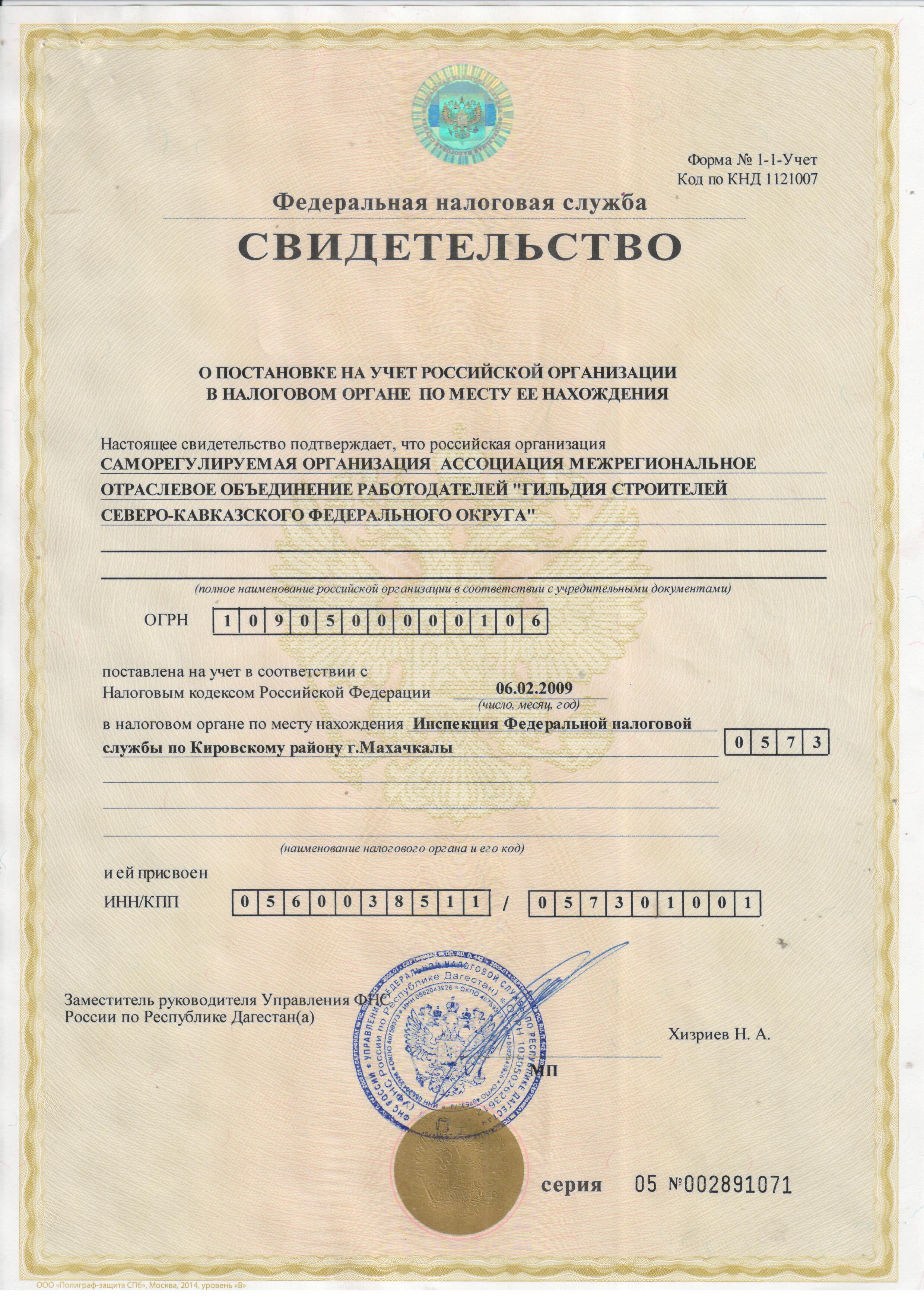 Свидетельство о постановке на учет в налоговом органе
