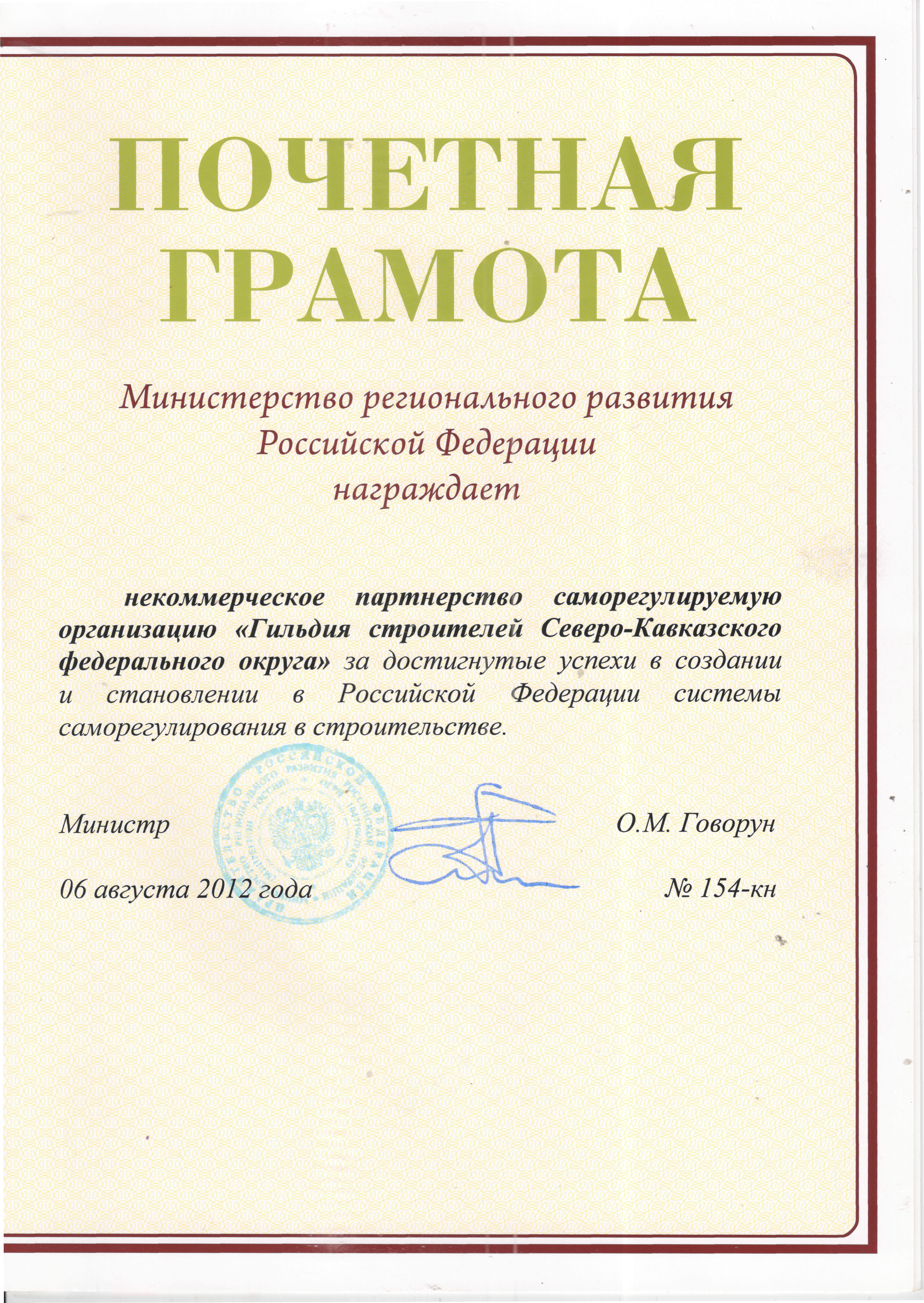 Грамота Министерства Регионального развития Российской Федерации (Приказ №154-кн от 06.08.2012 г.